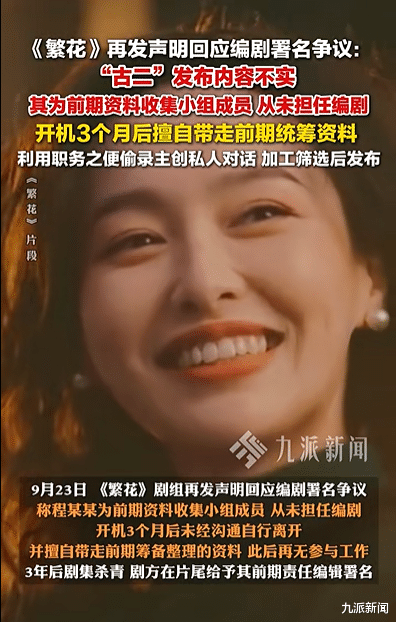 9月23日,《繁花》剧组再次发布声明,回应近期的编剧署名争议。
