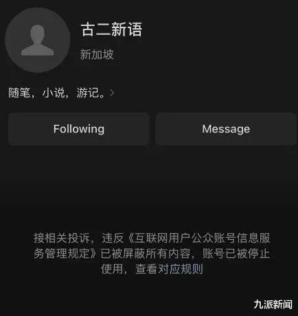 据澎湃新闻报道:在《繁花》剧组二度发声之后,记者检索了“古二新语”的公众号,发现此账号已被屏蔽,显示的屏蔽理由是:“接相关投诉,此账号涉嫌违反《互联网用户公众账号信息服务管理规定》。”